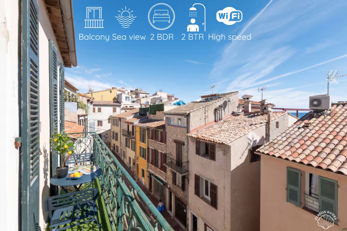 Newly renovated property with 2 bedrooms and 1 bathroom with direct view on the sea, the beach and the mountain. With all modern amenities (AC, WIFI, APPLE TV....) and beautiful decoration, this property has everything: a well equipped kitchen, large sitting-room, great dining-room. Linen and towels are provided with sample cosmetic items. A full concierge service is provided. Located in the heart of old Antibes, it is close to the train station, buse and the provencal market!