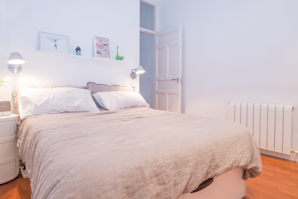 Enjoy the amazing location of this luxurious refurbished 1 bedroom, 1 sofa-bed flat (70m²) in the heart of Madrid, MALASAÑA! An area that offers a multitude of restaurants, leisure and culture, as well as easy and quick mobility throughout the city. The flat offers the highest quality, comfort and design for your stay. Everything is included: water heater, A/C, heating (heat accumulators), WIFI, sheets, towels and everything you need, whether for work or for fun!