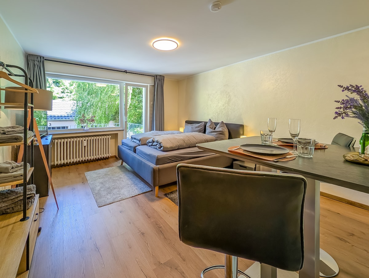 Modern, high-quality furnished 28sqm apartment for two people in the heart of Rüttenscheid. The district is known for its diversity, restaurants and bars and is characterized by its central location. The apartment offers everything you need for a stay in Essen: a comfortable bed (160cmx 200cm), Netflix & Amazon Prime, a fully equipped kitchen and a cozy dining area. The apartment is located to the back out to a green & quiet backyard.
