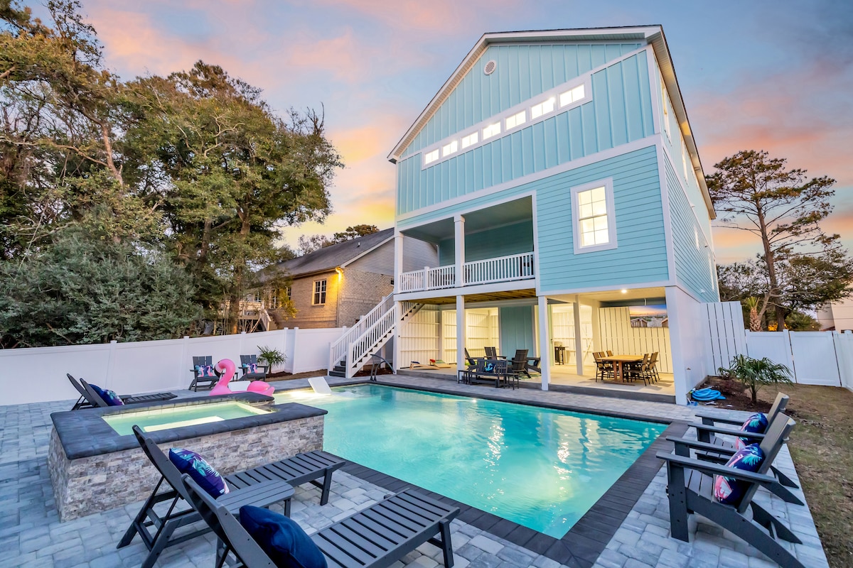 Family fun for all ages, located near the beach and intercoastal waterway. Safe central location with colorful artsy fun! New 2026 pinball. Lavish modern décor with comfortable King & Queen bedrooms. A short drive to family favorite Cherry Grove Beach. High tech sound & lighting systems, Dolby Atmos, LG OLED TVs, streaming & PS5 game system, arcade, foosball and new pinball machines. Tesla car charger. Full featured gourmet kitchen, Weber charcoal grill, and fire pit. Ready for play!