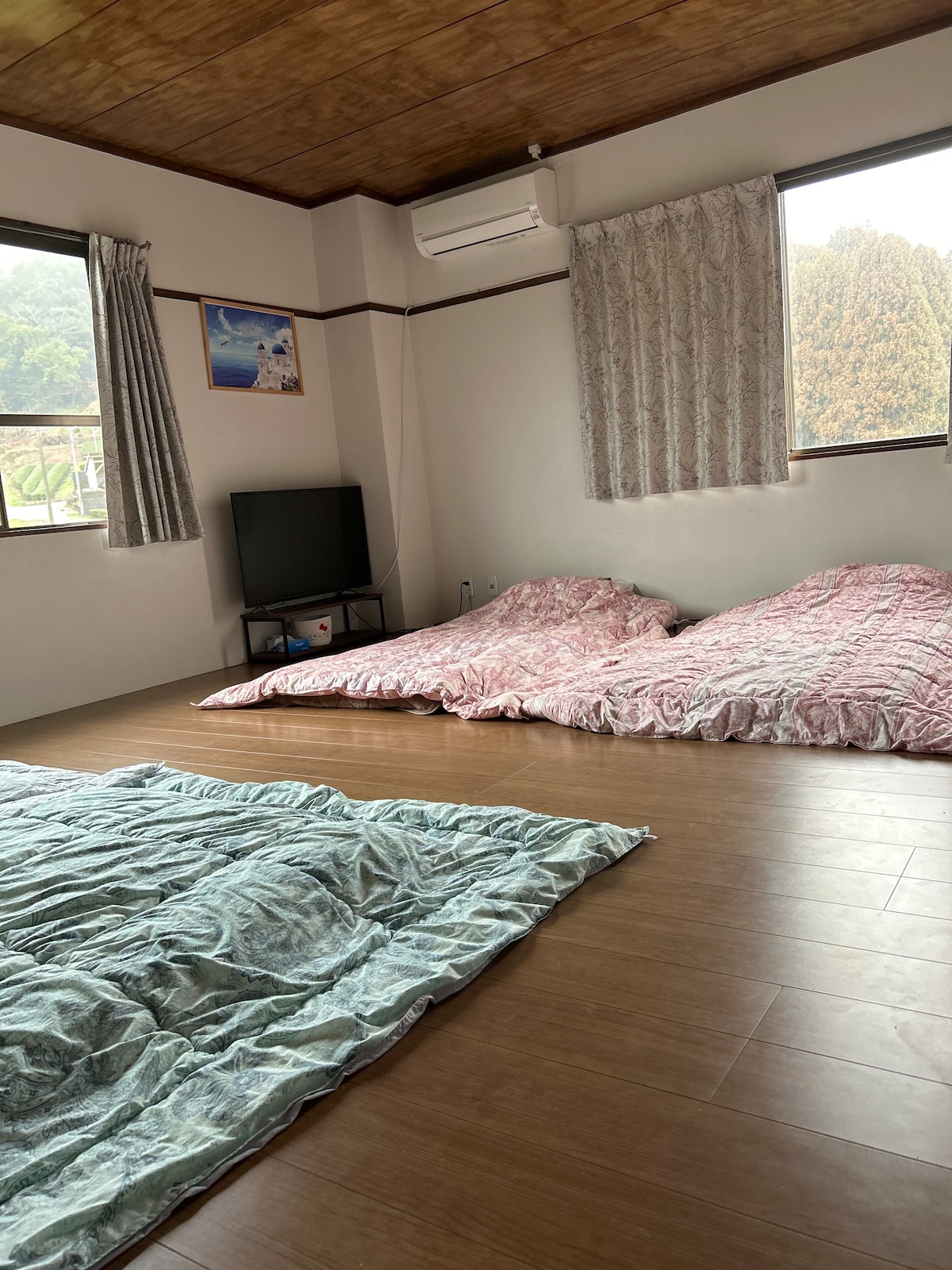 It's a big log house. The first floor consists of a large hall and a kitchen. Log houses also have excellent heat insulation and soundproofing. Even if the guest plays a musical instrument, it will not bother the neighbors. Accommodation is in the bedroom on the second floor and between tatami mats. You can also relax in the living room on the second floor. On the second floor, there is a gate on the stairs, so even small children can play in safe. High-speed WIFI and free parking.