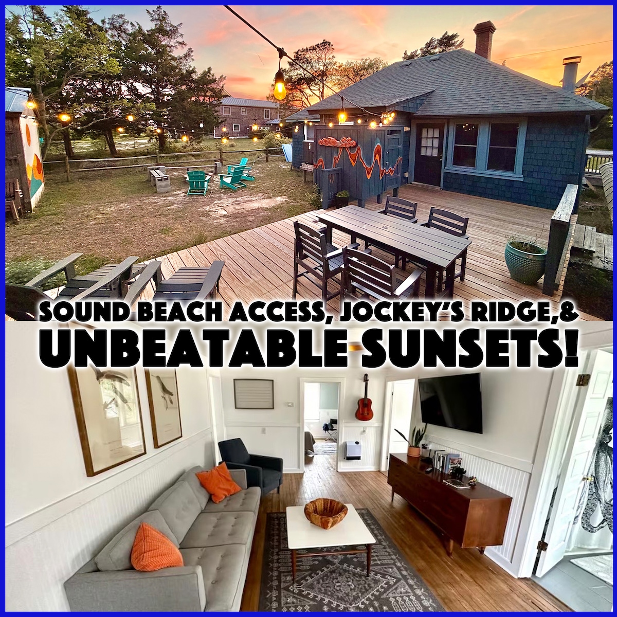 Location, location, location! Experience true Outer Banks life at our home on the famous & historic Soundside Road in Nags Head. Just steps away from a beautiful family friendly sound beach access and Jockey's Ridge, the sound views and sunsets are unbeatable. AND, the ocean is a 2 minute drive! Inside, we offer 3BD/2BA, as well as a cozy living area & kitchen. Outside, enjoy a spacious deck, outside eating, a firepit, & Italian lighting. Garage is stocked with beach essentials!