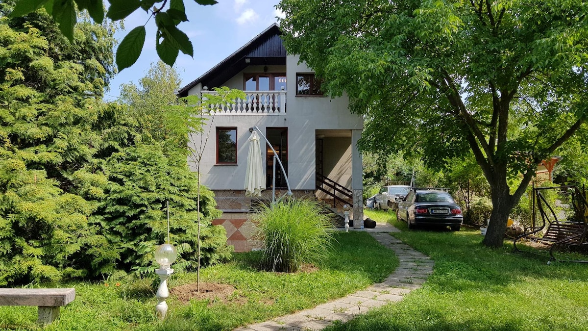 You'll love this clean, bright, separate apartment in the very heart of Solymár. The artsy apartment is only a few steps from the church - the center of village Solymár. The apartment is 70 square meters with one bedroom, kitchen/dining area, bathroom, and a large living area with a balcony overlooking the lush green garden and the hills. Air-conditioned. A welcoming and caring host and peaceful surroundings make your stay perfect.
