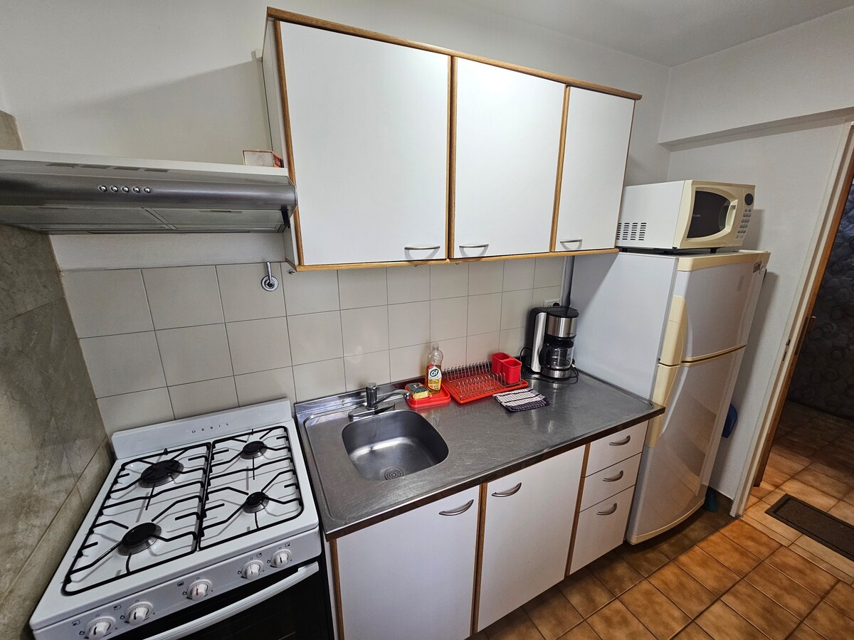Central two-room flat with an internal patio, warm and very bright, on the ground floor, ideal for visiting Bariloche as a couple or with friends. Wi-Fi service, Smart TV, underfloor heating, hot water, bed linen, towels... Kitchen equipped with a fridge-freezer, microwave, extractor hood, coffee maker, electric kettle, toaster, crockery and kitchen utensils.