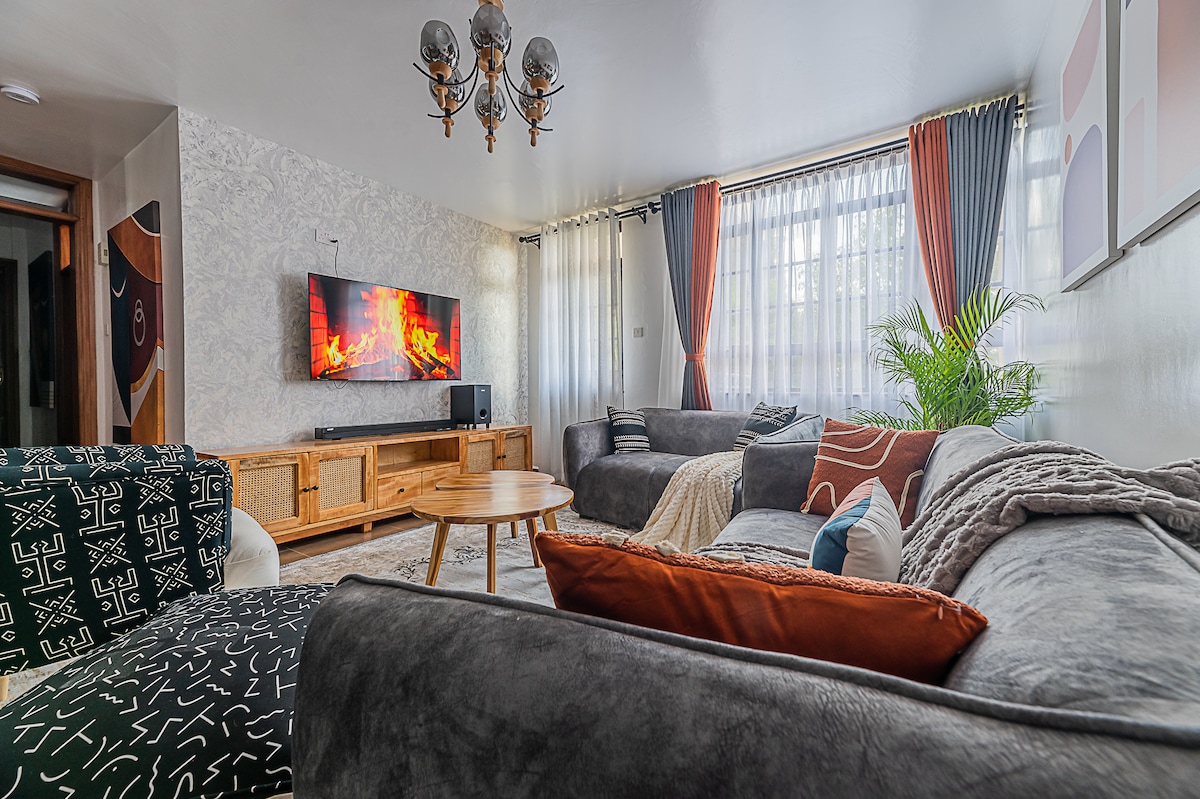 This entire stylish apartment is modern, spacious & comfortable, with one bedroom & en-suite bathroom, luxurious King size bed, eloquent dining room, bedroom & lounge Netflix-TV, balcony, kitchen and washing machine area. All amenities provided, including unlimited Fast WiFi and business facilities. Situated in a quiet leafy suburb, but also conveniently close to Westgate, Sarit and Lavington shopping malls, restaurants, business hubs, CBD and few meters walk away from Westlands nightlife.