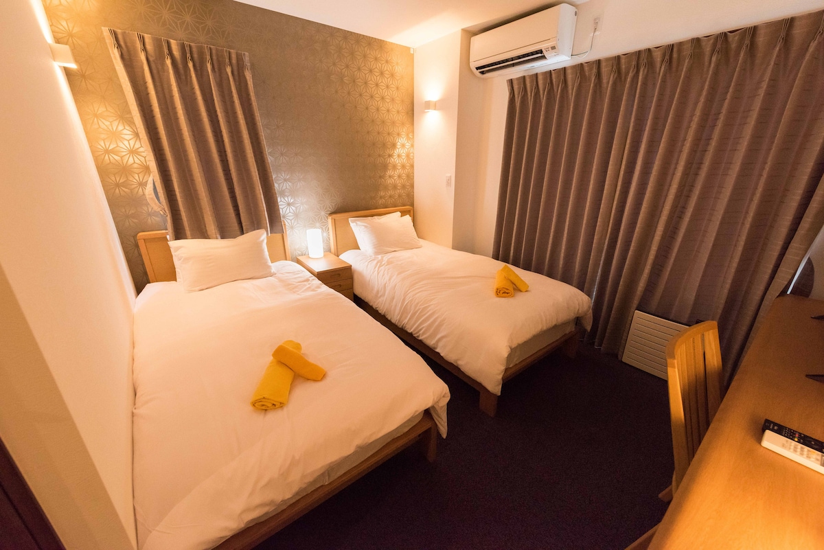 It's convenient for the whole family to go anywhere at this centrally-located place. The room is furnished with two queen-size beds, making it ideal for families or groups of friends staying together. The bed spacing is comfortable, and the layout provides private space.Sleeps up to 5 people. The open-plan kitchen is equipped with an induction hob, pots, pans and dishes, so you can easily prepare home-style meals or simple Japanese dishes. The bar connects the living and dining areas, making it the perfect spot for everything from a morning coffee to an evening meal. The washbasin area and the bathroom are designed separately, so even if several people are staying together, they can each maintain their own pace. Providing Bluetooth stereo, listening to music and taking a hot bath at night in Japan is the most relaxing moment of the trip. A projector is available in the room, which can be easily connected to popular digital streaming platforms. Fully equipped with a washing machine, air purifier, iron and a spacious wardrobe, we've got everything you need. The space is just right – perfect for working quietly at the bar on your own, or for staying with friends or family for a few days. Get along well and feel comfortable with one another.