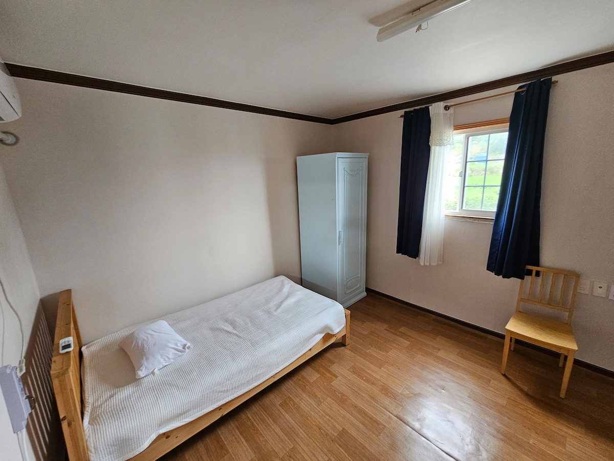 It is located in the center of Namhae Very accessible to tourist attractions It's a completely private pension, so it's more private. The sea view and the evening night sky are very beautiful. It is a beautiful pension in a quiet rural village. It is a double-layered structure of a private house, so it is Great for acquaintances There is a terrace, so you can have a barbecue (free) and a fire pit. It has a camping feel and an outdoor awning that adds to the mood on a rainy day. Bedrooms 1 queen bed, 4 super single beds, There are plenty of fluffy mats and they are clean. Bedding is provided. Kitchen Tableware and cutlery for large families, pots, frying pans, Electric pressure rice cooker (for 10 people), various seasonings, dining table for 8 people, Zaigle, Induction, microwave, fridge, electric kettle, coffee beans, grinder, coffee maker, ice maker (summer) Bathrooms Spacious bathtub and generous amount of towels, toothbrush, toothpaste, soap, body wash, body wash towel, shampoo, hair dryer, comb, hair comb Bicycle beam projector, Nintendo game console, children's book, badminton, baseball glove Rummikub, Jenga, etc.