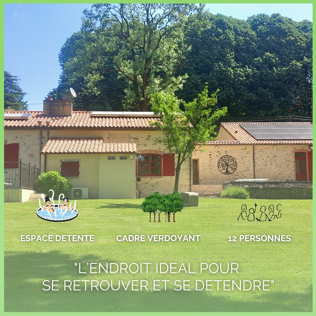 At the gates of Nantes, in the vineyard near the Sèvre Nantes, come stay with us. Possibility of professional massages on site by reservation. As an annex to our accommodation, the rental includes : a comfortable bedroom of 16m² (bed 160), an equipped kitchen, a shower room with toilet, a large living room of 30 m² with sofa bed, fireplace, TV and access to sauna and jacuzzi, private terrace, garden furniture. Free access to the fenced landscaped garden and pond.