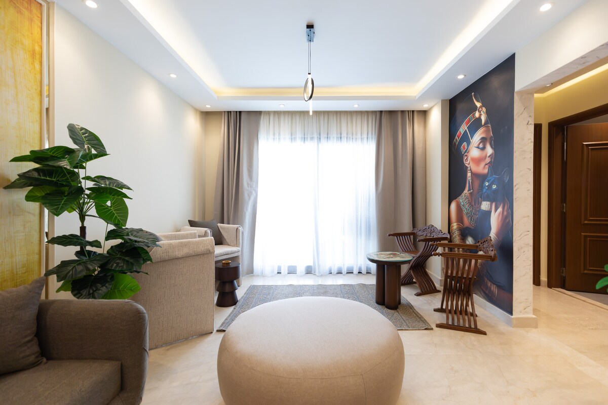 House of Nefertiti – A Royal Stay in Cairo Live like royalty in this elegant, Egyptian-themed apartment—just minutes from City Centre Almaza, Cairo Airport, and Downtown. Enjoy a private in-unit jacuzzi, fully equipped kitchen, cozy living space, and a peaceful, family-friendly setting. Perfect for couples, solo travelers, or families looking for comfort and a touch of history. Your pharaonic escape awaits!