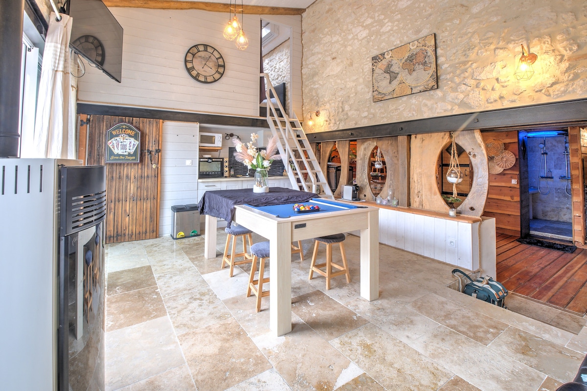 This former farm is ideally located at the crossroads of Dordogne and Gironde between Bordeaux and Périgord. It will offer you a beautiful outdoor space and beautiful interior volumes; its room with wagon beds will delight children and its large farmhouse kitchen that of parents. The swing, ping-pong table or space for the little ones, and board games will be available. Many sightseeing spots: St Emilion, Bergerac, Monbazillac...