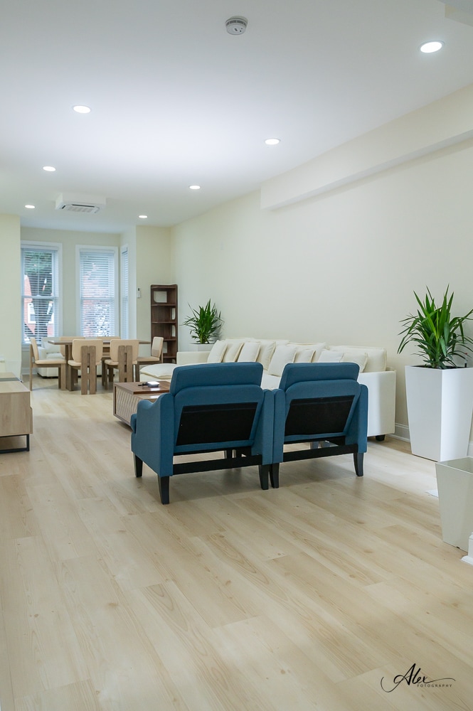 modern clean, newly built space with over 2000 square ft of space .Full kitchen with stainless steel appliances. Private entrance and quiet space. Large windows that bring in lots of natural light. 9” ceilings, designer blinds, modern floors Soft water filtration system available I have 2 ring cameras outside the property one located above of garage and one above the deck. They are motion detected and will start recording when motion is detected. Full disclosure this is for security.