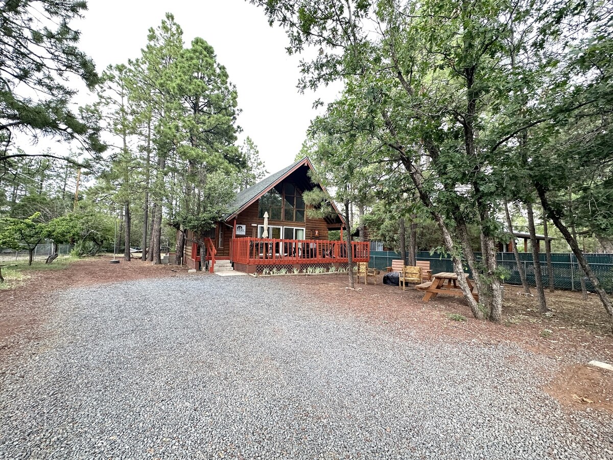 Pinetop-Lakeside cabin! This rustic A-Frame cabin blends tradition with modern amenities, surrounded by tall pines. Approximately 1200 sf, 3 bedrooms, 1.5 baths, with a King bed, Queen, 2 full beds and loft futon. The fully fenced yard enhances security, while the large front deck and screened-in porch offer outdoor serenity. Enjoy staying cozy indoors or spend time outdoors in the fresh mountain air and the warmth from either the gas or wood firepit.