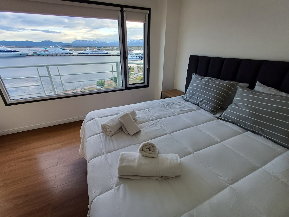 Beautiful apartment located in a complex on the shores of the Beagle Channel. It has two bedrooms, one with a double bed and another with three single beds. A kitchen-dining room equipped with dishes and utensils that give you total independence. The bathroom has a whirlpool bathtub. From its windows you can enjoy incredible views of the Beagle Channel and the Navarino Islands. The complex has a spacious living room and a desk so you can work comfortably.