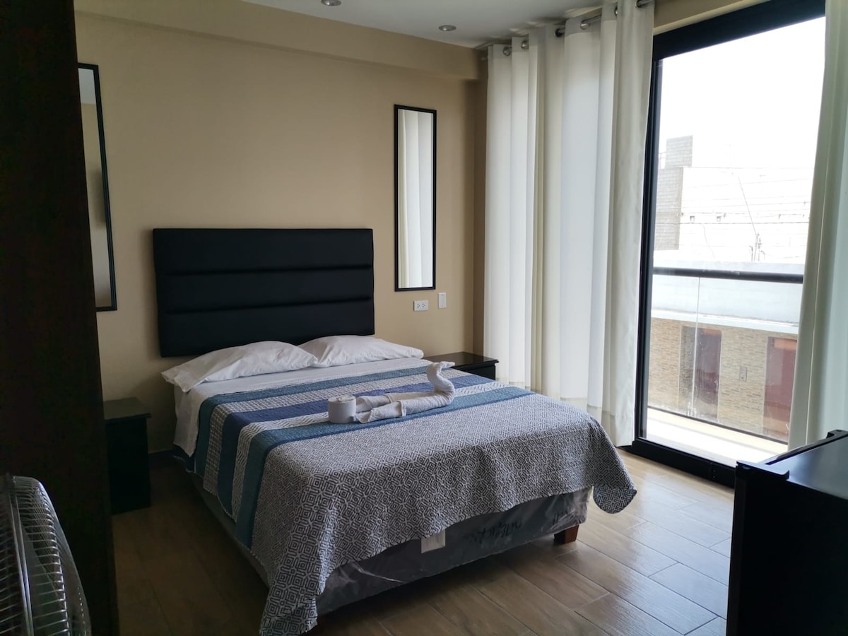 Brand new hotel with modern and comfortable rooms, equipped with a double bed, desk, closet, cable TV, private bathroom with hot water 24 hours a day and WiFi internet connection; in addition, it has a coworking area and security monitoring with cameras 24 hours a day.