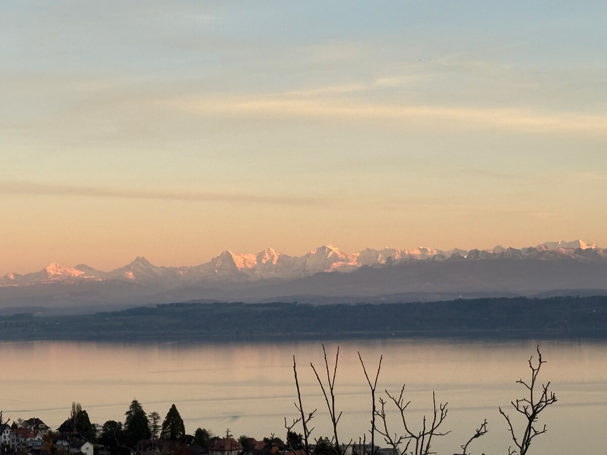The cozy 2-room apartment offers a fully equipped kitchen (including dishwasher, kettle, Delizio coffee maker, toaster), dining table, living room with sofa bed, bedroom with large double bed, bathroom with shower, toilet and washing machine/dryer. Wi-Fi and TV (Swisscom incl. 7-day replay) Large terrace with lounge and dining area with beautiful views of Lake Murten and the Alps. You can park your car directly in the garage, which is also the access to the apartment.