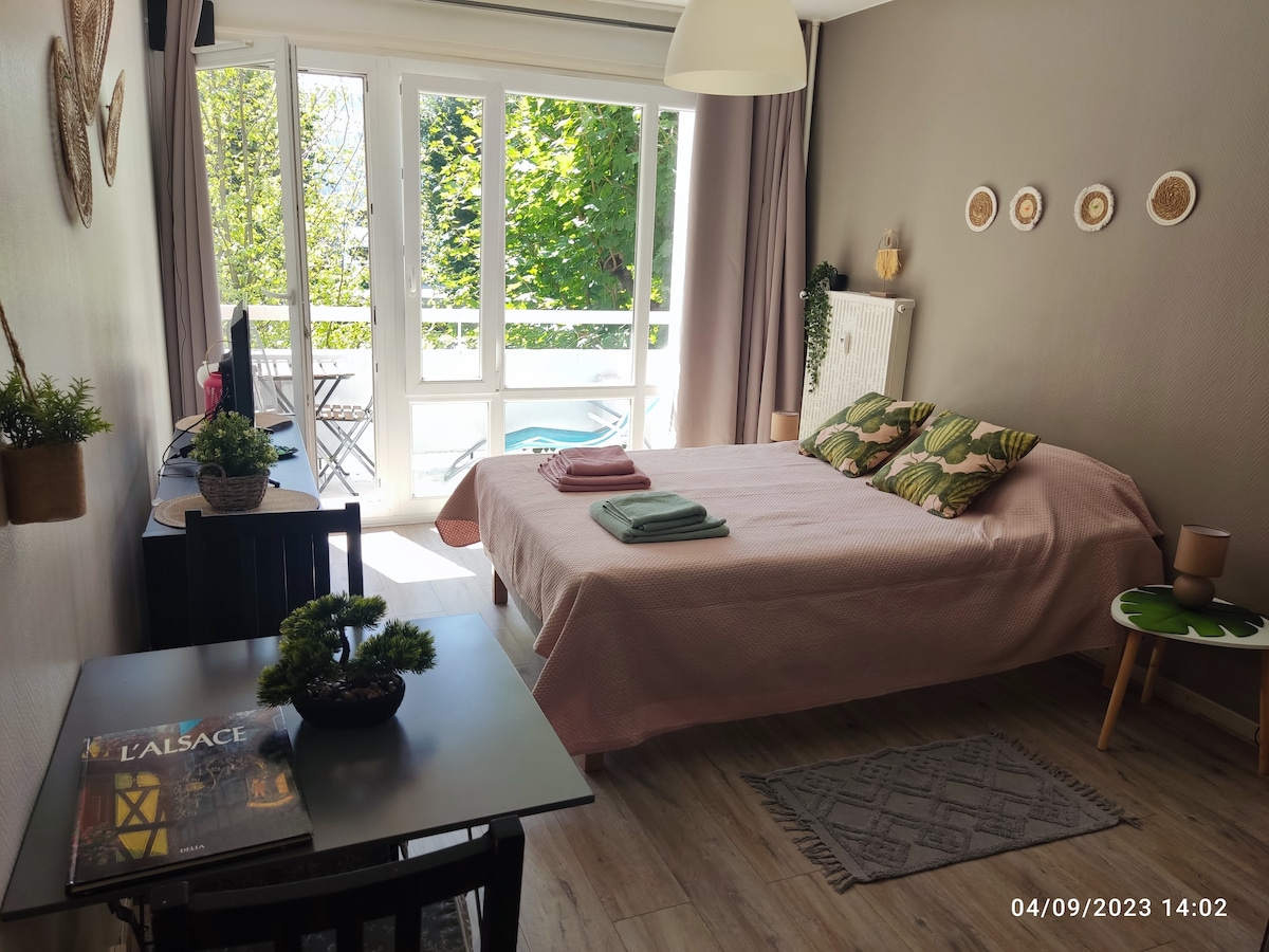 Entire home located on the 1st floor, with balcony & private garage 🌟 It consists of a living room with open kitchen and a bathroom with toilet. The advantages of the accommodation 🌟 🏡 Quiet and wooded residence, balcony without overlooking neighbors 🚗 Private garage included with access badge 🏙️ Only 5 minutes from the city center by tram (15 minutes walk) 🚋 Tram A and D only 200 m away (Schluthfeld stop) 🚉 Central station 15 minutes by tram Ideal for discovering Strasbourg with ease.🗽