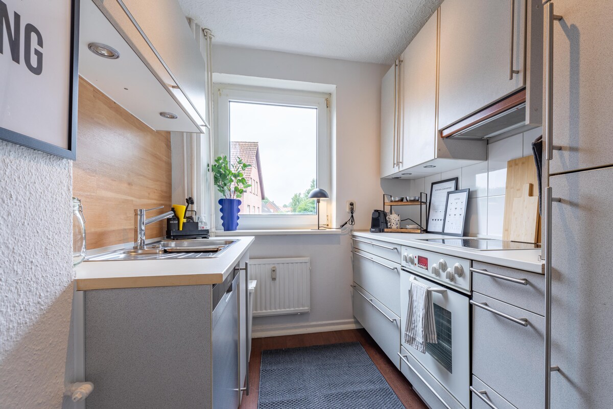 Experience incomparable style on 90 square meters in the Mokka Suite Neumünster, minutes from the designer outlet center, train station and the Holstenhallen. Two bedrooms with box spring beds guarantee relaxing nights, the shower bathroom exudes modern charm with black accents. A fully equipped kitchen and smart TV ensure a comfortable stay. Private parking available. Location (in minutes) Designer Outlet Center: 5 Train station: 3 Holstenhallen: 7 Hamburg & Kiel: 35