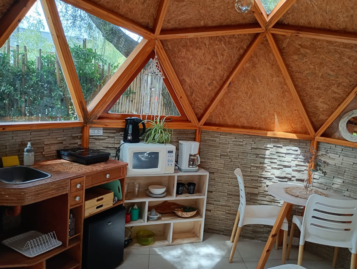 Es una cúpula de 80 M2. Amplio espacio de 8 metros de diámetro,muy luminoso, con grandes ventanales, una cama de dos plazas y una de una plaza. Entrepiso con un pequeño escritorio. Esta construcción fue realizada artesanalmente por un escultor local. El espacio es el interior de una escultura,lo que permite tener una experiencia distinta a lo convencional. Los muebles y los objetos son únicos realizados especialmente para el lugar.
