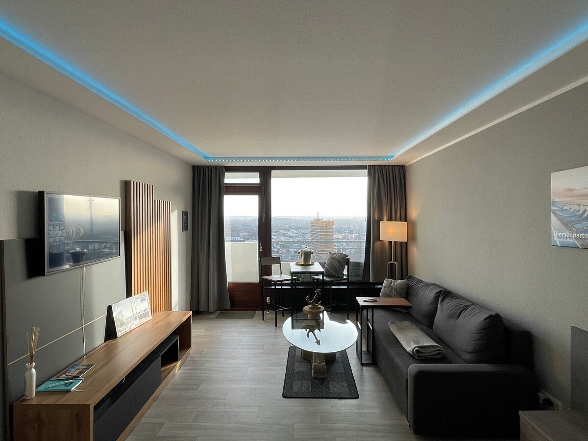 Erleben Sie einen einzigartigen Blick auf die Stadt und das Ruhrgebiet in Ihren exklusiven Themenpartment in über 60 Meter Höhe. Die Panoramafenster ermöglichen Ihnen einen atemberaubenden Ausblick auf die faszinierende Metropolregion. Genießen Sie zahlreiche Services wie Nespressomaschine, Set Handtuch, versch. Tee Sorten, Netflix, Disney+, Paramount+, Samsung FRAME Smart TV, zentrale Lage (5min zur Innenstadt). Tipp: buchen Sie direkt 2 Nächte und profitieren Sie von Rabatten