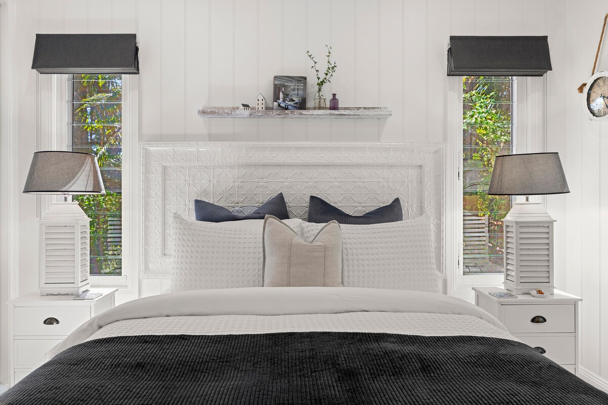 Spacious, private and comfortable top floor apartment with exclusive entrance through own enclosed Franjipani gardens. Generous light-filled living areas and breezy balconies. Extra large master and queen bedrooms with treetop views. Quiet location opposite nature reserve. Outdoor bbq/ daybed/ dining/ firepit in beautiful secret garden. 2 minute walk to river in Bruns. Walk to beach, cafes, restaurants, bars, pub, shops, markets and enjoy the simple pleasures of our special riverside village