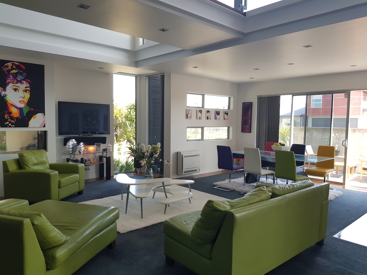 Sunny New ,Two Story beachside townhouse ,exclusively yours located in a quiet corner away from main road with outdoor space, Air mattress supplied for extra guest Walk 30 seconds just across the road to the beach and 1 min to the new beachside Hot pools,cafes restaurants ,bars and shopping Facilities within 5 mins walk , surf ,fishing , walking ,explore the sights and this great location, weekend markets and great surf beach out front and the Famous New Brighton Pier is only 1 min walk away