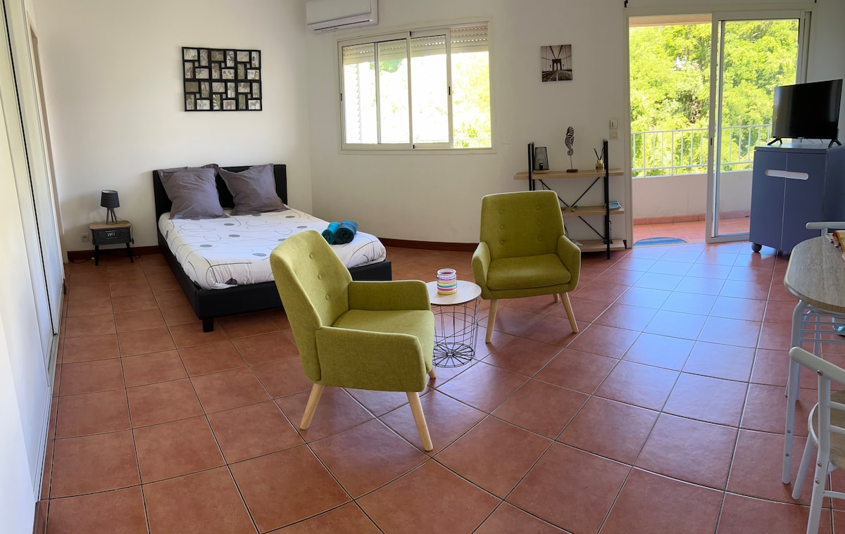 C’est un grand studio de 45m2 sur une colline avec petite vue sur la mer. Le logement est fonctionnel et dispose de tous les éléments nécessaire à votre bien être pendant votre séjour. Il est entièrement équipé: cuisine, salon, espace nuit, salle de bain, wc séparé, balcon, parking, buanderie, ascenseur, cilmatisation. À proximité il y a toutes les commodités nécessaires à votre séjour: marché, commerces, école, centre-ville, restaurants, transport, etc.