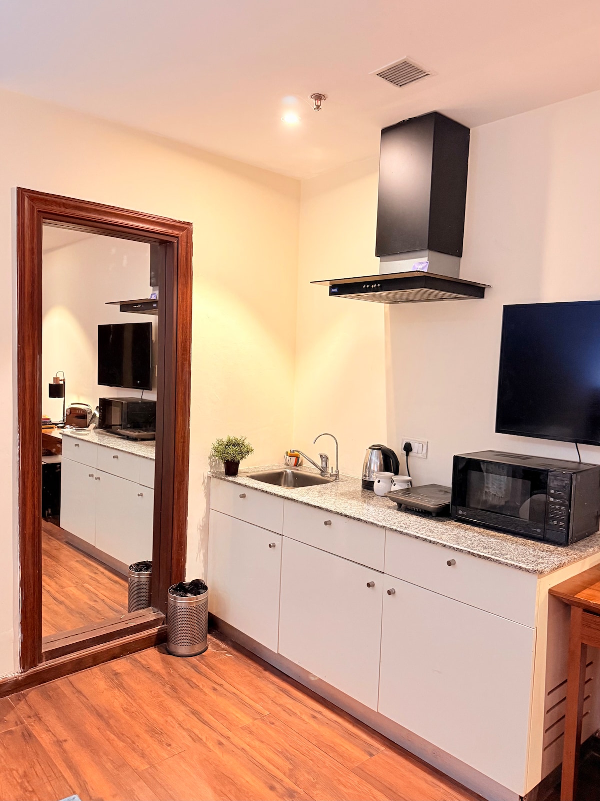Premium 1BHK Service Apartment in Sector 43, Gurgaon with AC in living room & bedroom, plus a kitchenette with induction, microwave & cutlery. In a posh area, walking distance to Gold Souk Mall & Shalom Hills School, 2.2 km from Millennium City Centre Metro & 2.1 km from Fortis Hospital. Foreign guests are welcome. Early check-in will be subject to availability and chargeable Rs.500 as well as late checkout will also be the same with ₹500 added for every 3 hrs thereafter.