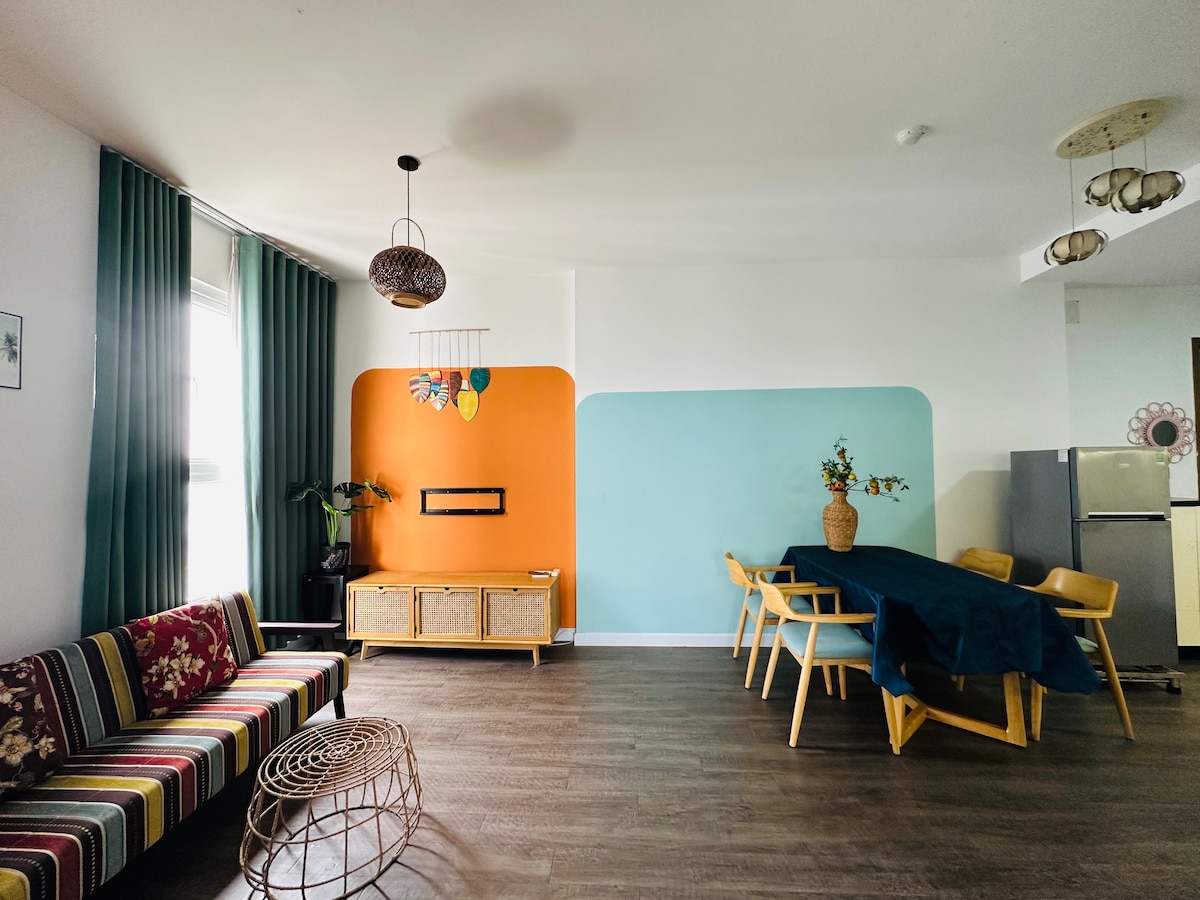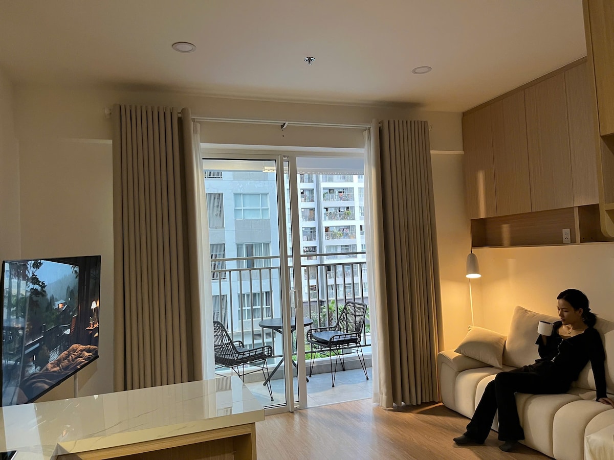 A stylish & comfortable apartment with balcony 85m2 at Hung Phuc Happy Residence located in the heart of district 7, Phu My Hung, with just a short walk to stores, mall, restaurants, and conveniences. Nearest bus stop in front. Highly educated and quite neighbors that surrounded by green parks and beautiful villas. Decorated in modern Japandi x Wabi sabi style with a focus on natural materials & clean lines. A great getaway or even staycation for those who want to experience new things.