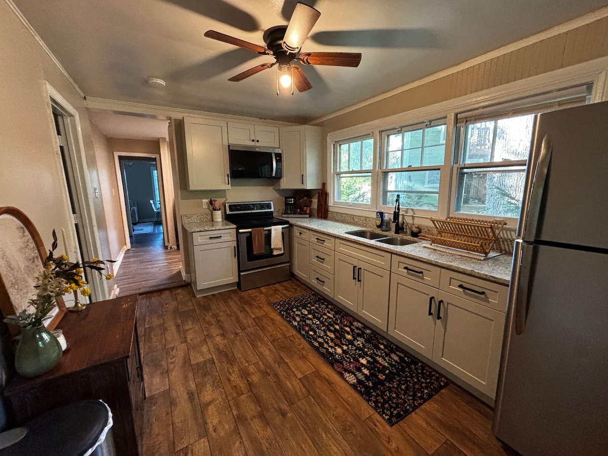 Reconnect with friends and family in our newly remodeled guesthouse. The main living space is open and light filled. A great place to enjoy a family game night. The bedrooms are just the right size to enjoy a restful nights sleep. Need to do laundry- no problem this guest house has it’s own laundry room with stackable washer and dryer. Roast s’mores by the backyard fire pit and enjoy watching the lightening bugs from the deck.