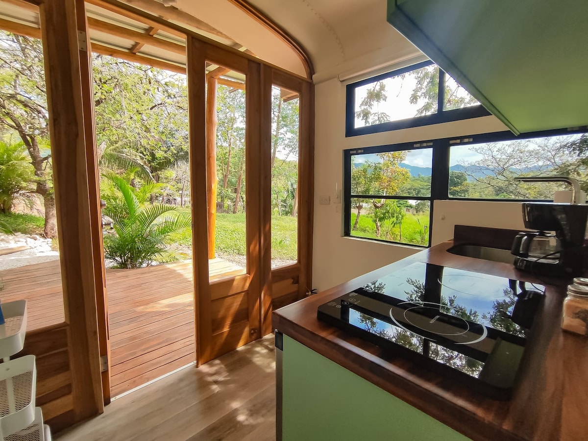 Escape to a stylish converted bus with a private plunge pool and panoramic valley views. Enjoy a queen bed, full kitchen, rain shower, Wi-Fi, and a handcrafted Guanacaste desk. Located in peaceful Tierras Morenas, just 20 min from Lake Arenal. Perfect for couples or solo travelers seeking nature, comfort, and a unique experience.