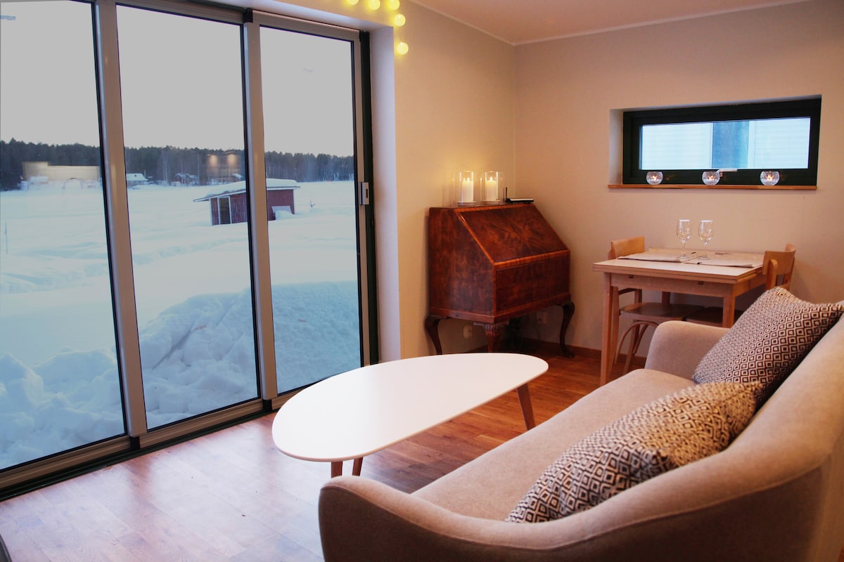 Right by the water, this is arctic nature at your doorstep. 5 mins from Luleå by car, 15 min by bus. Perfect romantic get-away, a quiet retreat/chill-out spot with Luleå's amenities just a bus/bike ride away. Sleep in a comfy bed and have a sauna by the lake! Dishwasher & washing machine, 2 km to supermarket. Trails for running and skiing right by house. Ski/skate/bike/kayak rental. In winter see the northern lights over the frozen lake, the location and view is stunning. Wifi 500/500. Welcome!