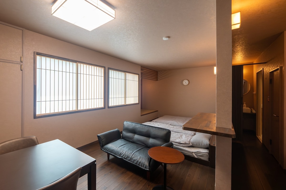 The Kuromatsu Suite is a private chalet with a loft, tatami room, kitchenette, shower booth, and small terrace. The loft sleeps 2 in the queen bed plus 1 on a floor futon. Alternatively, you can set up two futons in the tatami area on the ground level. Daily private 1-hour sauna sessions with sauna wear are included. Enjoy free luggage storage before check-in/after check-out and complimentary washer/dryer use. All guests can enjoy our little zen garden.