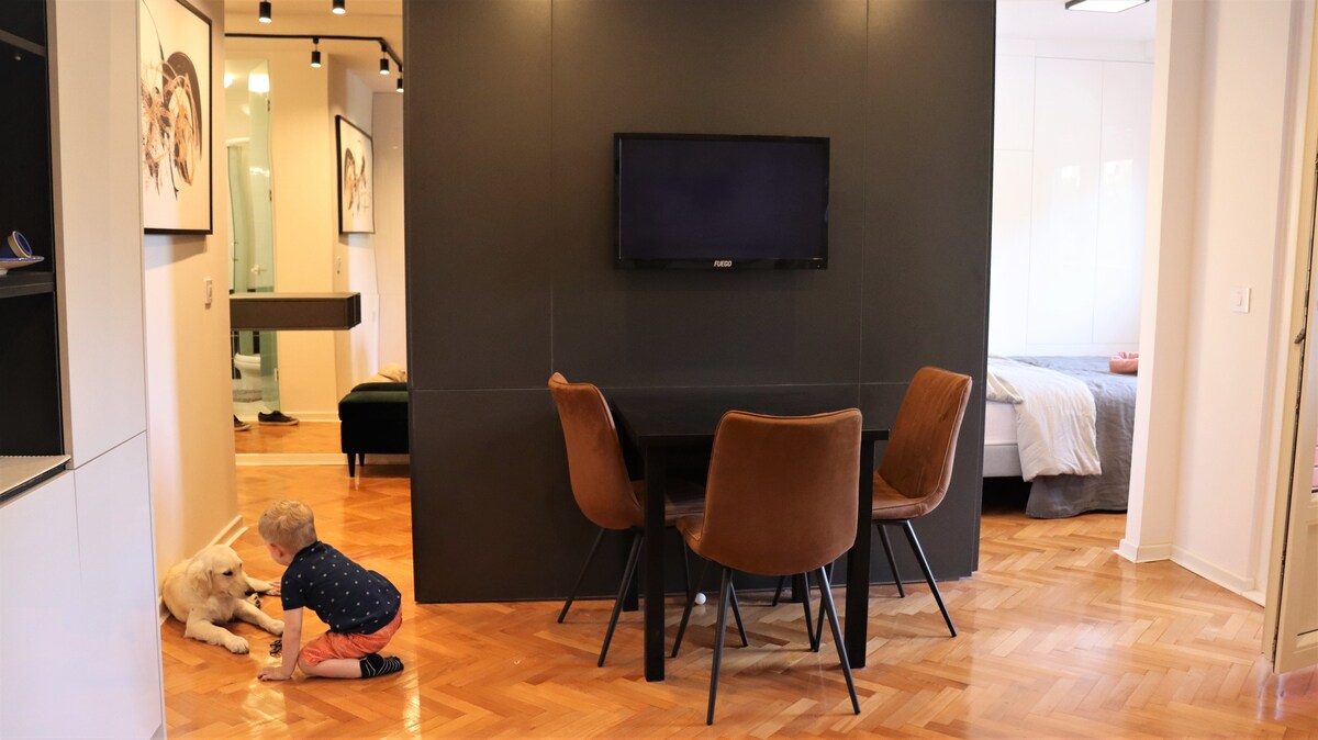 One of our modern and cozy apartments, located in the heart of Niš, in the building with one side on the main pedestrian street and the other side leading to our private parking. Our customers consistently praise our apartments' first-rate cleanliness and altogether superb experience, from checking in to sleeping on our top-rated mattresses in calm yet super-central settings. Unique interior design with many thoughtful features and fast internet will also ensure that you have a wonderful time.