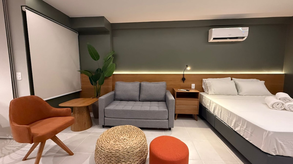 Studio strategically located to offer you the best in Niterói. Our location has easy and quick access to everything you need. The Studio is comfortable, quite bright and well decorated. Perfect for couples/guests alone. It has: . Drinking water filter, . Queen size bed, (Master Spring ORTOBOM), . 500Mb WiFi, . Split 18.000 btus, . Streaming TV, . Vaporizer, . Hairdryer 2000w (Taiff), Laundry share, Front desk 24/7.