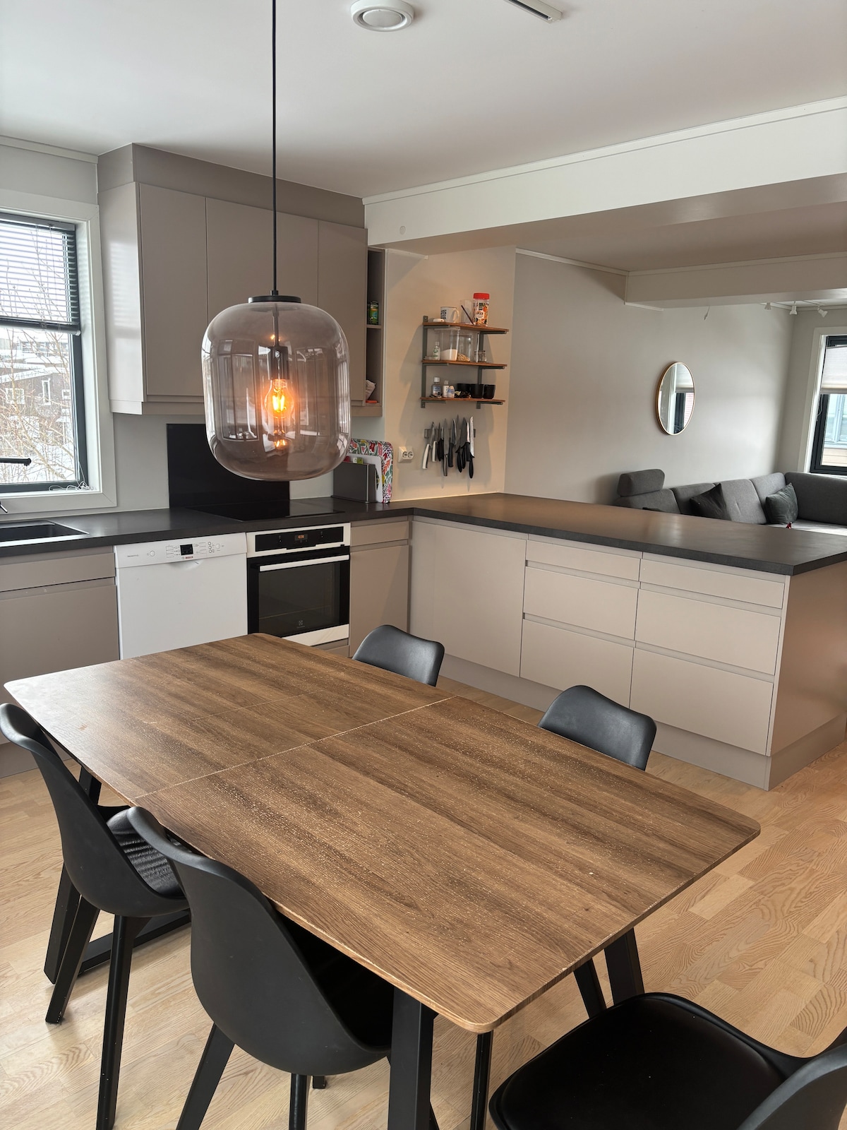 Nice attic apartment. Bright and pleasant, with good views over Oslo. Best accessible by car. The apartment is fully furnished, including bed linen and towels (washing and changing of bed linen and towels is included in the cleaning fee) Contains entrance, living room, 2 bedrooms, kitchen, bathroom and storage room. Short distance to: Stovner center with all facilities, subway and bus stop, hiking terrain. Parquet in the living room and bedroom, tiles with heating cable on the remaining floors. Private parking for one car. NO CHARGING POSSIBLE.
