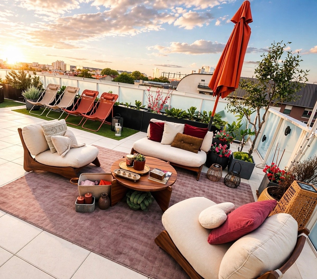 Rooftop Elegance is a bright and stylish apartment featuring a huge private 86 m² terrace, offering the perfect setting to relax, enjoy the sunshine, or share pleasant moments together. The terrace includes a comfortable lounge area, sun loungers, decorative greenery, and a dedicated workout space. The apartment is designed in a modern and refined style, with a warm atmosphere comparable to a hotel-quality stay. A unique place to enjoy a true private rooftop experience near Paris. ✨🏙️🌿