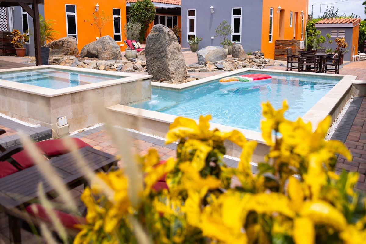 It's a 4 unit apartment complex with a swimming pool/with a shallow lounge area. There is a main door that welcomes all guest on to the property. Every apartment has a dedicated porch which leads to its private entrance. All apartment units have garden and pool view from the living room. There are 3 one-bedroom units and 1 studio apartment. Only 3-5 minutes drive to Eagle Beach and Palm Beach or a 15-20min. walk. You can rent one room or the whole complex to accommodate a big family or a group.