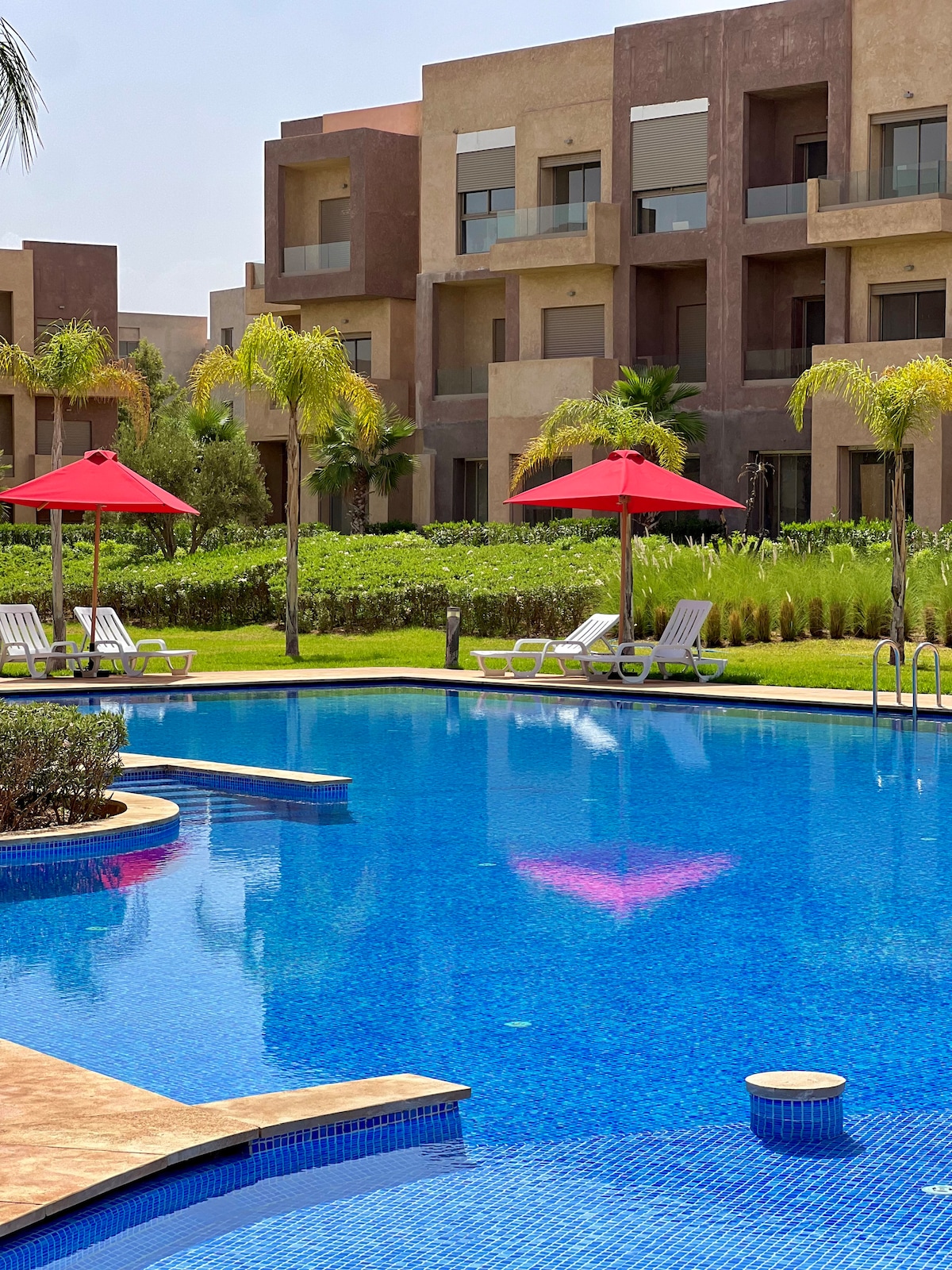 Escape to this stunning Luxury Apartment in Marrakech's notorious Noria Golf Residence. Enjoy a captivating view of the sparkling pool and the convenience of a Dedicated Workspace with ultra-fast Fiber Wi-Fi . Perfect for Families,Remote workers,and Group of friends Comfortably sleeps 5 across 2BR/2BA. We offer premium amenities including Washer/Dryer, Nespresso/Air Frier, Free Secure Parking, baby crib. Just 10 minutes from the Airport and a short taxi to the Old Medina and Gueliz city Centre