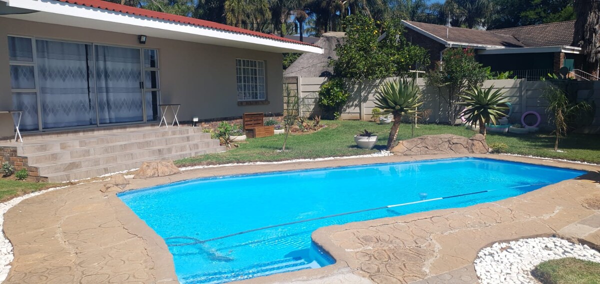 This charming two-bedroom, one-bathroom unit, located in a safe secure neighbourhood, accommodate six guests comfortably. Both bedrooms offer plush queen-sized beds. The living area doubles as an additional sleeping space, with a sofa bed for extra guests. A modern bathroom offers all the essentials for your stay. Open-plan kitchen, fully equipped and adjoining dining area. Relax in the cozy living room or step out to enjoy the patio and swimming pool. Enjoy free wifi and no load shedding