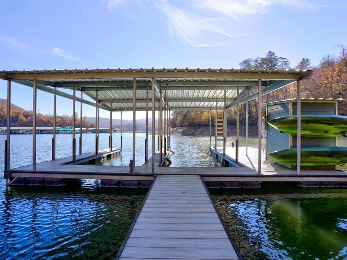 Peaceful lakefront retreat on Norris Lake with stunning views, two large porches, and a private tram to your own double-decker dock—perfect for swimming, sunbathing, or evening lights over the water. Surrounded by forest and undeveloped land for total privacy. Wind down at the lakeside fire pit or take a short 0.4-mile walk to Twin Cove Marina for boat rentals, live music, and dining. A perfect spot to relax, explore, and enjoy nature.