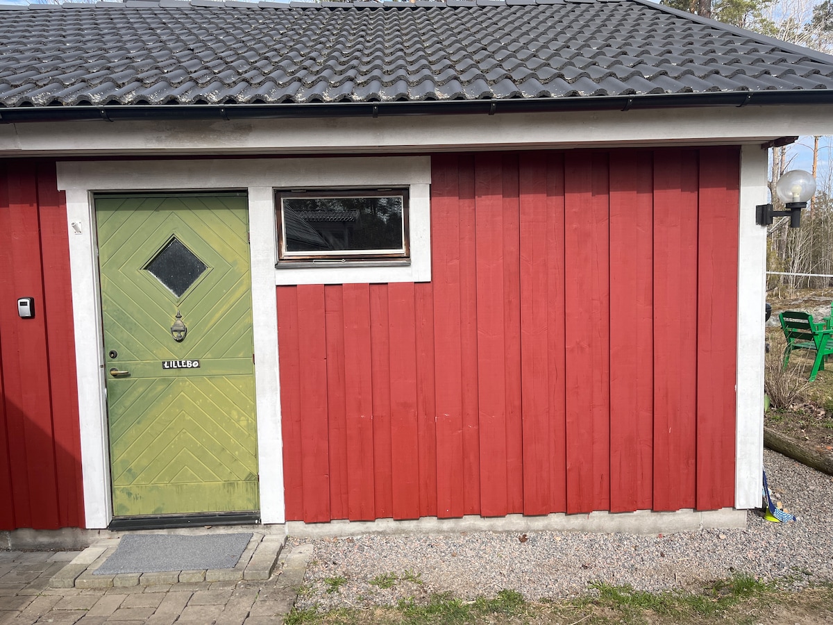 Modern ground floor apartment with own front door. Own access to the apartment and garden with patio. Free parking at the apartment. Bed linen and towels included. Apprecciated accommodation for business travelers. Weekly and monthly discount. Quiet residential area close to E4. 50 m² with kitchen, bedroom, bathtub, washing machine, living room, sofa bed. Upon booking, you will receive a personal code for the front door's smart lock. 250 meters to grocery store, bus stop. 4 km to the town center