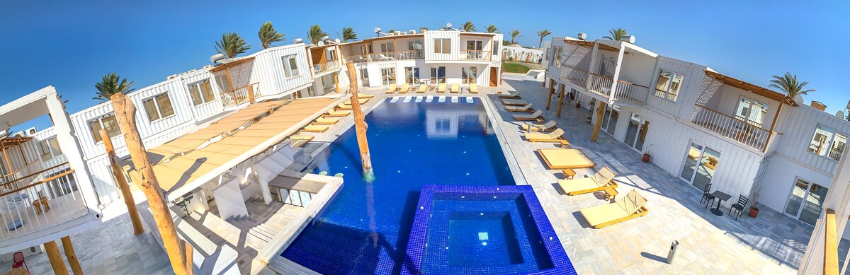 A two-bedrooms apartment,second level floor, full furnished- full equipped where you can enjoy a total private and fun holiday. build out of containers that will make you gaze out of surprise. overlooking a big private 24 hours working pool and jacuzzi. All wood furniture is in-house made with a marvelous modern look. Two big bedrooms , one bathroom, beautiful balcony , a big living room with a direct exit to the pool.