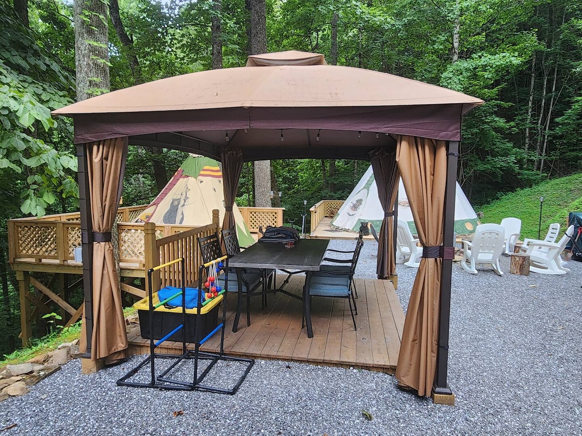 Our treetop tipi is a 1 of a kind experience you will not soon forget! Take a short nature walk up to the roughly 400 sf tipi decked out in woodsy cabin decor. With 3 comfy beds don't forget your friends! Enjoy your morning cup of tea or coffee on the porch while gazing into the canopy of trees and listening to the array of bird songs which are sure to impress even a non-camper! This glamorous campsite is doused with personal touches you're sure to love as much as we do!