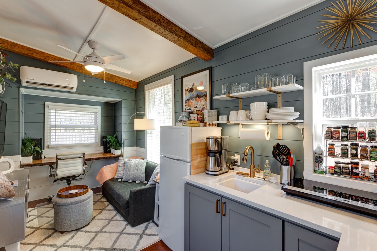 The tiny home is located in the scenic neighborhood of Haw Creek, tucked away in nature but only a 5-minute drive to downtown. The house is walking distance to Penny Cup Coffee and Creekside Taphouse, two local favorites. Large trees and wildlife abound in the backyard and can be viewed through the bedroom windows or from the brand new back porch. Inside, the tiny home has a modern yet rustic feel. You will find everything you need, and your host lives on the property and is just a text away.