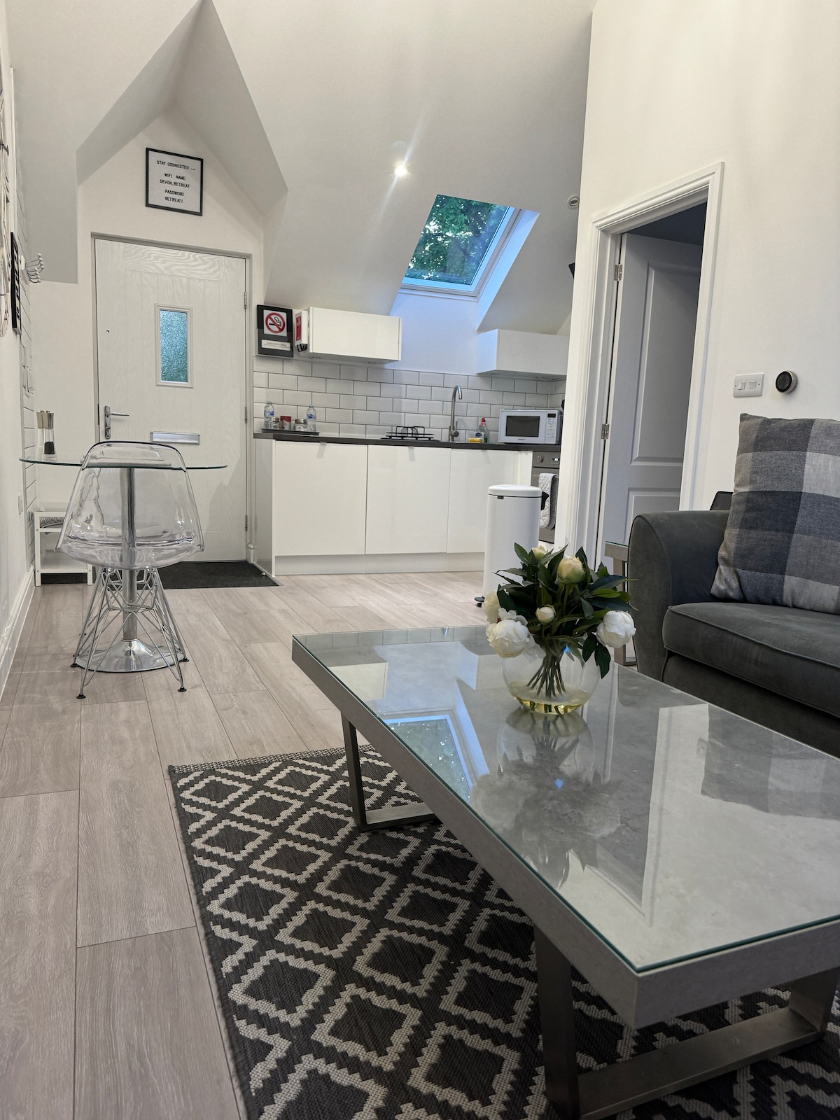 Instagram: Devon_retreat Recently built self contained annex. Not adjoining main property, parking space for one car. Brand new fixtures, kitchen and bathroom. Smart TV’s in both the bedroom and the lounge area with internet access. 6 seater Hot Tub, available at property for guests to use. iPad supplied with attractions and eateries pre loaded for guests to browse. Nest Smart heating controls controlling dedicated boiler for guests. Situated on a quiet newly developed estate.