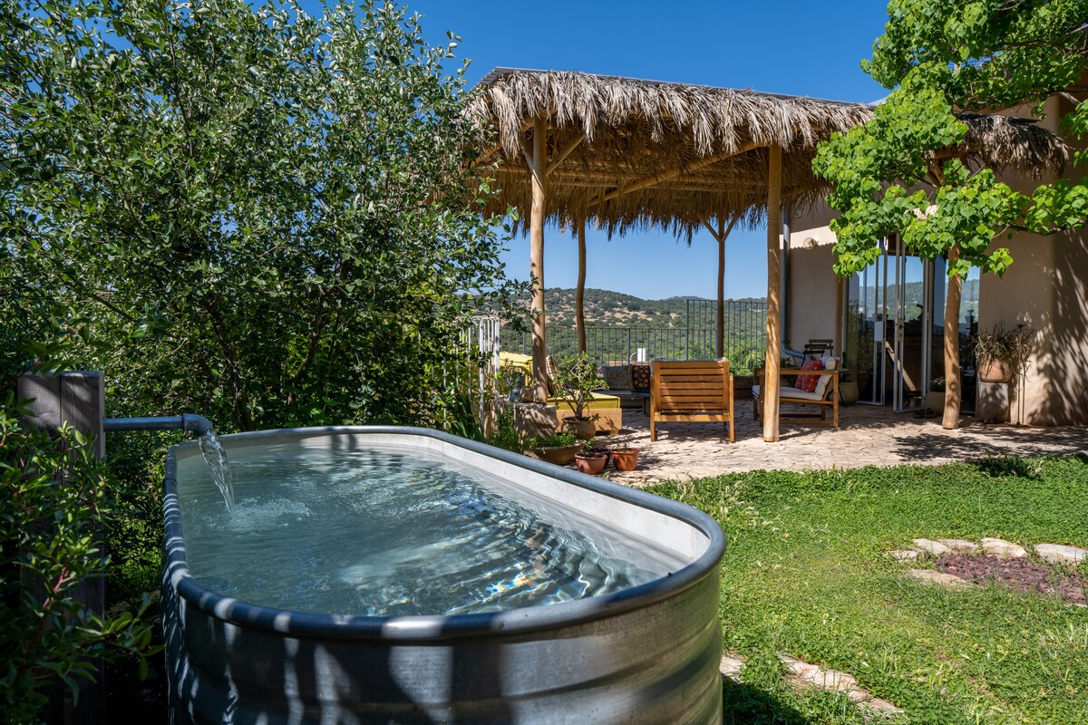 בלב הטבע הפראי של צפון רמת הגולן, בין הרי הגעש הכבויים, המעיינות הצלולים, הבוסתנים העתיקים והנופים עוצרי הנשימה בנינו בית שמשקף בצורה מושלמת את סביבתו הטבעית. קירות בתינו האקולוגי מצופים בטיח אדמה, ובחלונות שלנו רואים שקיעות מדהימות ונוף פתוח. הבית מרווח ומתאים לקבוצות. בפרגולה מול הנוף יש ג'קוזי ספא ענק ופרטי, פינות ישיבה, בחורף קמין שמחמם את הגוף ואת הלב והמטבח מאובזר בכל מה שנחוץ. בגינת המאכל שלנו גדלים פירות יער מיוחדים ומגוון ירקות שזמינים לקטיף לאורחים שלנו . שימו לב שזה בית מגורים.