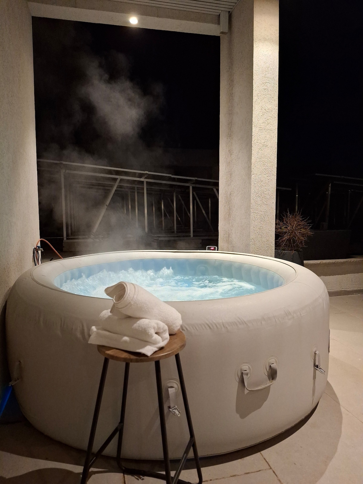 Welcome to “Bikat HaKeren”, located in the moshav of Had Nes in the Golan Heights. The property features 2 charming cabins. Each cabin is built as a studio unit and is fully equipped with a double bed, wardrobe, TV, a jacuzzi, kitchenette, 2 convertible armchairs, sauna, a dining area, and a private terrace. In the shared outdoor area, guests can enjoy a heated swimming pool, a barbecue area, and seating areas. Each cabin is suitable for hosting up to 4 guests (a couple + 2 children).