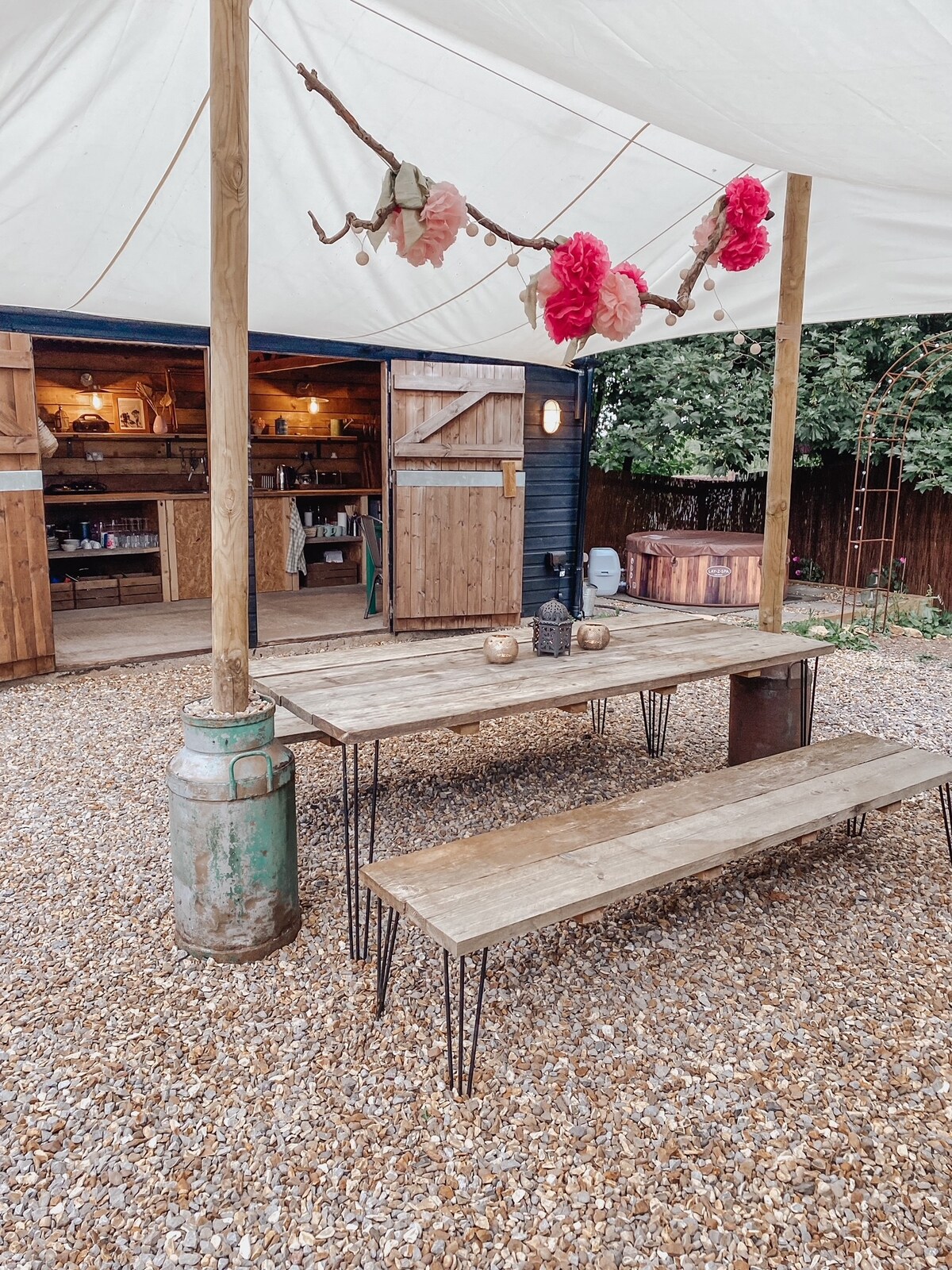 Poppy tent has a proper double bed Mini fridge Electric lights and fairy lights inside it. Single futon Electric charging points Rugs Tea lights Tea coffee sugar Double burner gas stove little pots and pans and stove top kettle. Lovely roll top bath shower attached sink and a composting loo (cleaned when needed) Outside pizza oven Picnic bench Bbq Fire pit Wood charcoal matches provided 🌼🌼Hot tub charged at £30 per stay🌼🌼 paid via air bnb extra services
