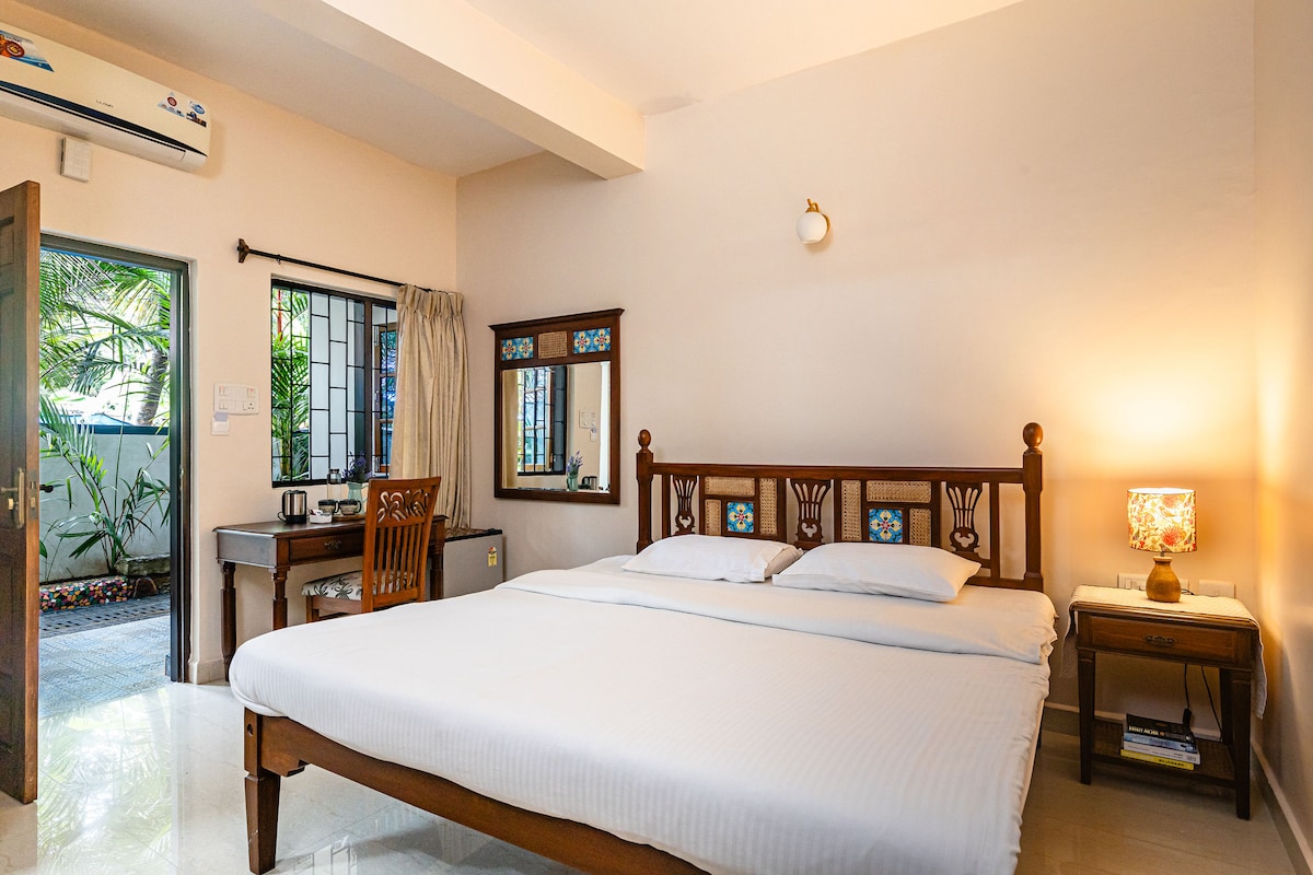 Welcome to your serene getaway just a 10-minute walk from Benaulim Vaddi Beach. Nestled in a friendly neighborhood, this cozy room is adorned with modern Portuguese-style furniture, offering everything you need for a relaxing stay or travelers on the go. Nearby, you'll find restaurants, grocery stores, and rental services for bikes and cars. Ideal for solo adventurers, free parking is also available. Enjoy easy access to famous cafes and nightlife spots, ensuring a memorable coastal retreat.