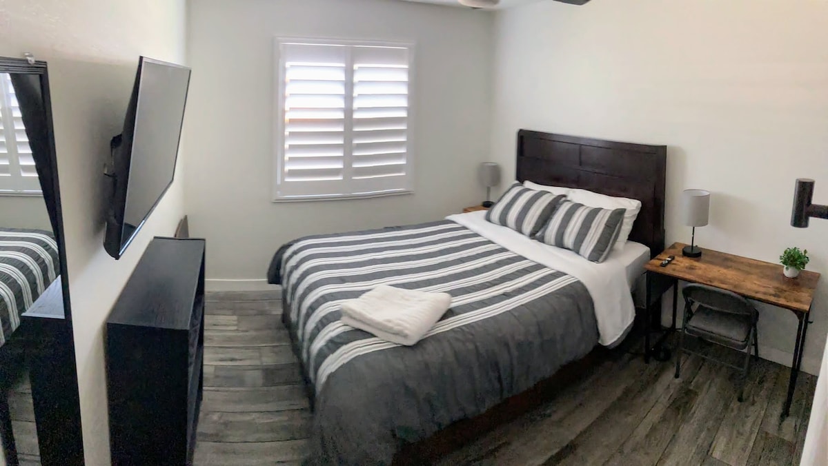 Fully remodeled private studio designed for both comfort and peace of mind! We lived here for a year before hosting, so I can confidently say it's safe & welcoming. Enjoy the beautifully updated bathroom with a rainfall shower head, and sleep soundly on a luxurious Eclipse Glacier KING bed with four Sealy pillows. Modern amenities include: - 58" Smart TV - Free Wi-Fi - New Washer & Dryer Conveniently located near Phx Sky Harbor Airport and 25 mins from State Farm Stadium.